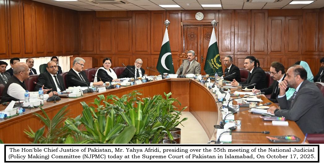 Islamabad, October 17, 2025- The 55th meeting of the National Judicial (Policy Making) Committee (NJPMC) was convened today at the Supreme Court of Pakistan under the Chairmanship of Hon’ble the Chief Justice of Pakistan. The meeting was attended by the Chief Justice of the Federal Shariat Court, the Chief Justices of all the High Courts, while Attorney General for Pakistan attended on special invitation. The Committee deliberated on key policy issues, while reviewing implementation status of the decisions taken in its 54th meeting. It unanimously reiterated its resolve to strengthen institutional capacity, accelerate access to justice, and ensure efficient and effective justice delivery. It emphasized the importance of sustaining institutional coherence among all tiers of the judiciary to improve accessibility, efficiency, and integrity in the dispensation of justice.