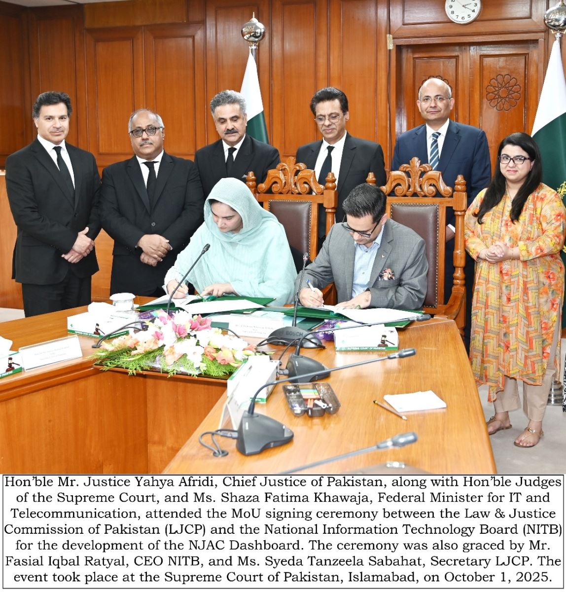 The MoU was signed by the Secretary, Law and Justice Commission of Pakistan, and the Chief Executive Officer, NITB. The agreement provides for the joint development of an Analytical Dashboard for the Judiciary—a digital platform that will consolidate judicial data, integrate information from across the justice sector, and incorporate monitoring parameters of the National Judicial (Policy Making) Committee (NJPMC). The dashboard will allow real-time tracking of case disposal rates, backlog trends, and institutional efficiency, supporting evidence-based policy making, performance-driven reforms, and enhanced transparency.