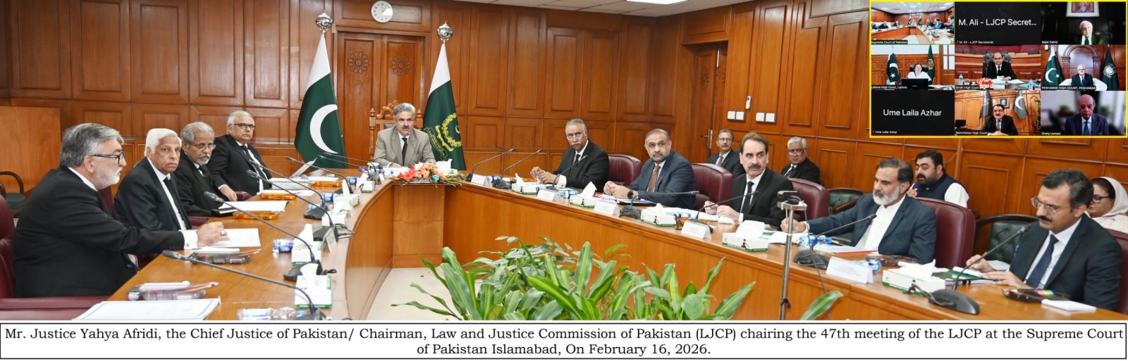 Islamabad, February 16, 2026 - The Hon’ble Chief Justice of Pakistan/Chairman of the Law and Justice Commission of Pakistan (LJCP) chaired the 47th meeting of the Commission today at the Supreme Court of Pakistan, to deliberate upon proposals for advancing law reform in line with constitutional mandates and contemporary societal needs.