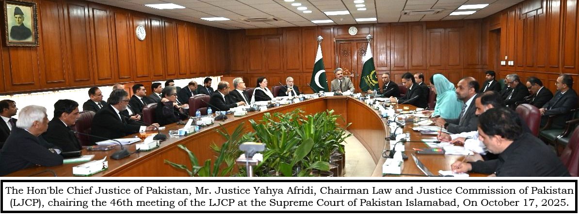 Mr. Justice Yahya Afridi, the Chief Justice of Pakistan/ Chairman, Law and Justice Commission of Pakistan (LJCP) chaired the 46th meeting of the LJCP held today at the Supreme Court of Pakistan. The Commission underscored the importance of legal reforms, particularly in the Code of Criminal Procedure and Family Laws, highlighting that these reforms are crucial for ensuring that the justice system remains relevant and effective in addressing the evolving needs of society. These reforms will help streamline legal processes, protect citizens’ rights, and promote fairness and justice in the dispensation of justice.